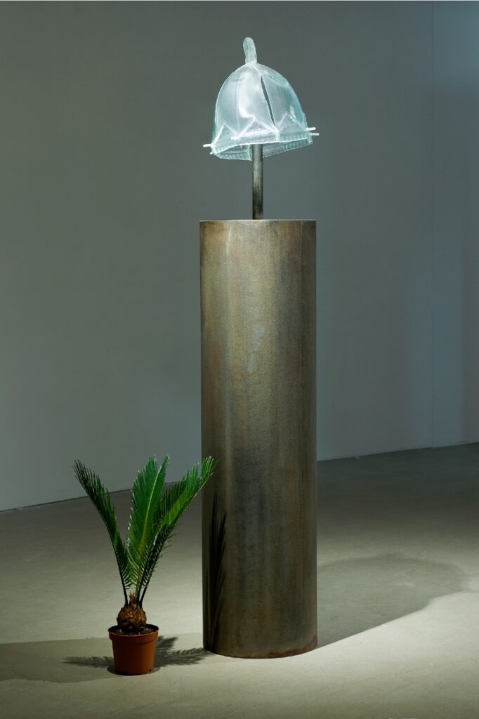 (photography, metal and glass object, living plant)